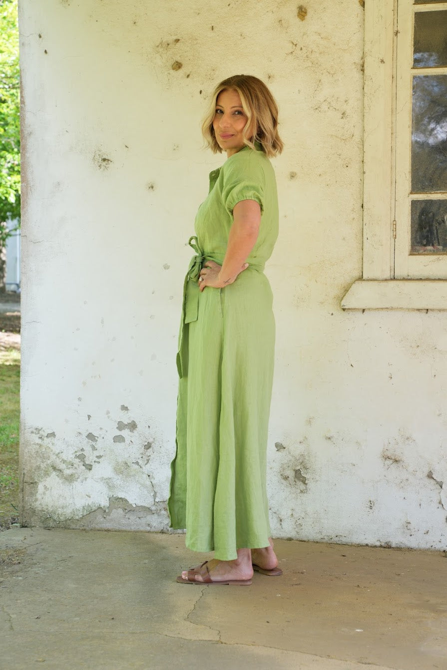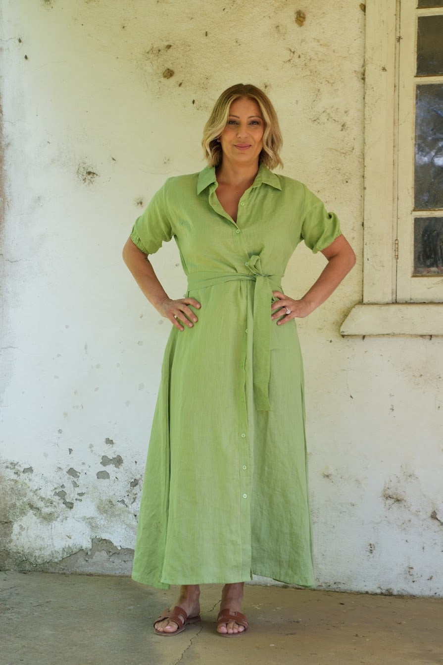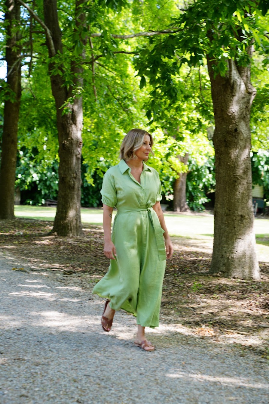 The Fleur dress features a button-through design that allows for effortless wearability and adds a touch of sophistication. Complete with a linen tie belt, it offers versatility in creating a customised fit and accentuating your waistline. The inclusion of convenient side pockets adds both style and functionality to this gorgeous dress. The Fleur sleeve has a slight puff and is elasticated for comfort.