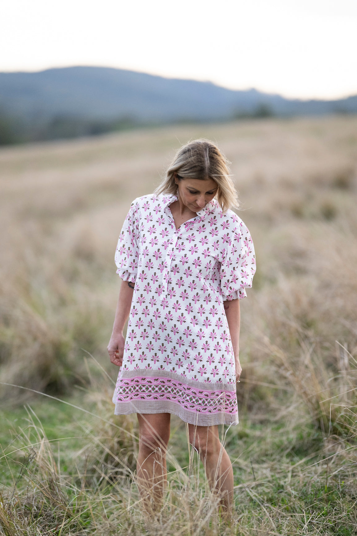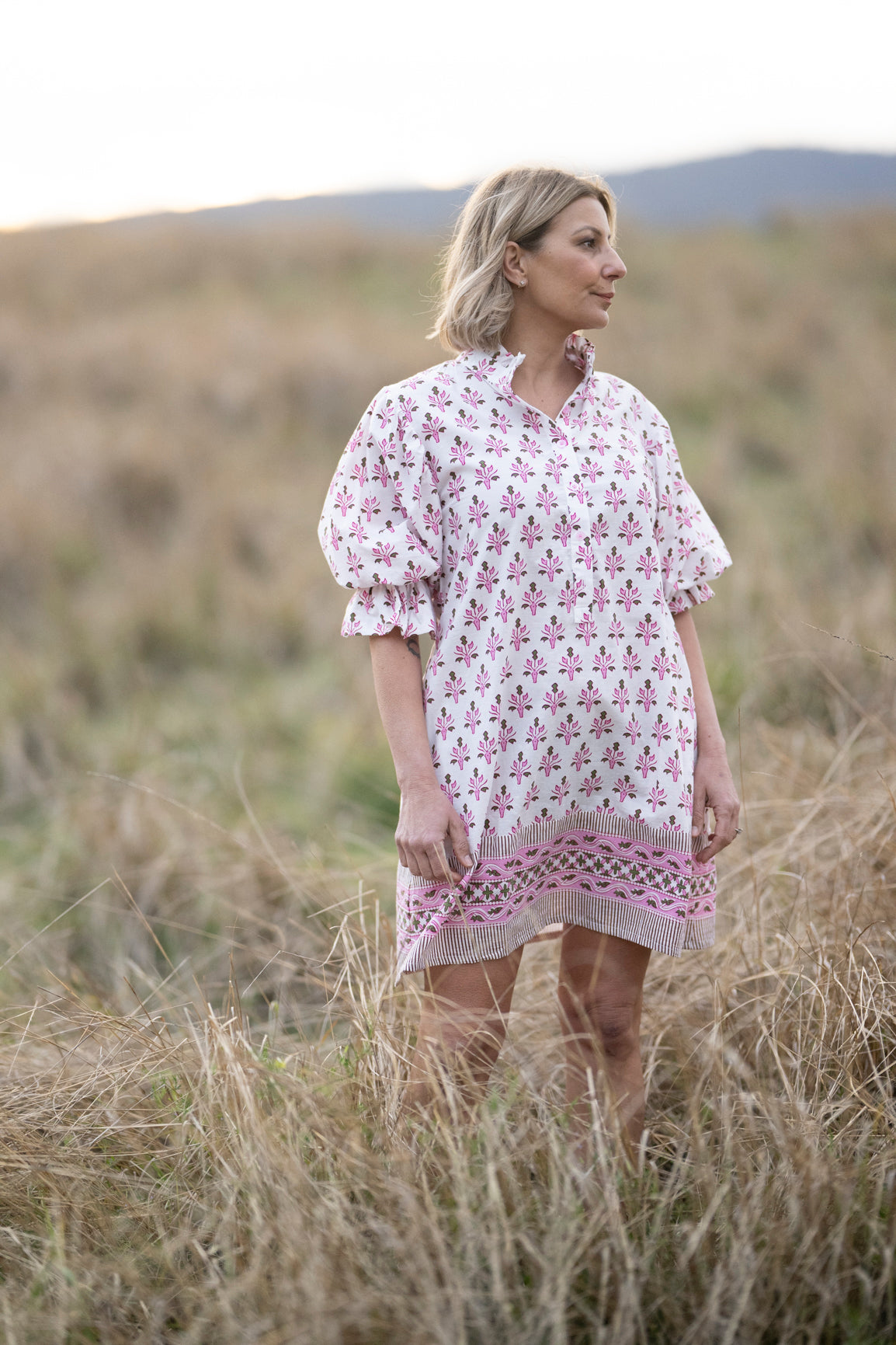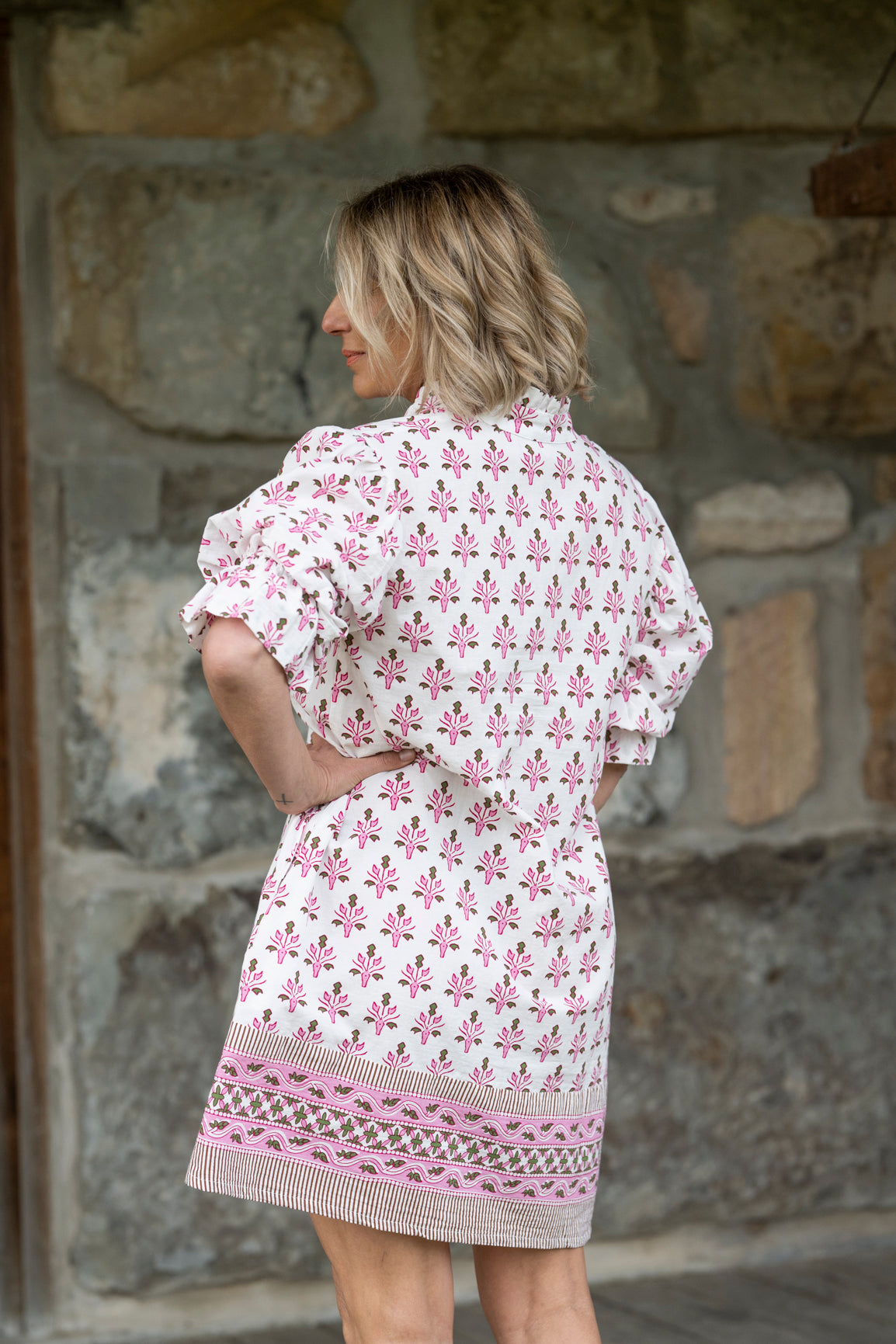 Of course, we’ve added side pockets because who would buy a dress without them. The sleeves are puffy with an elastic ruffle cuff for comfort and a button front for versatility.