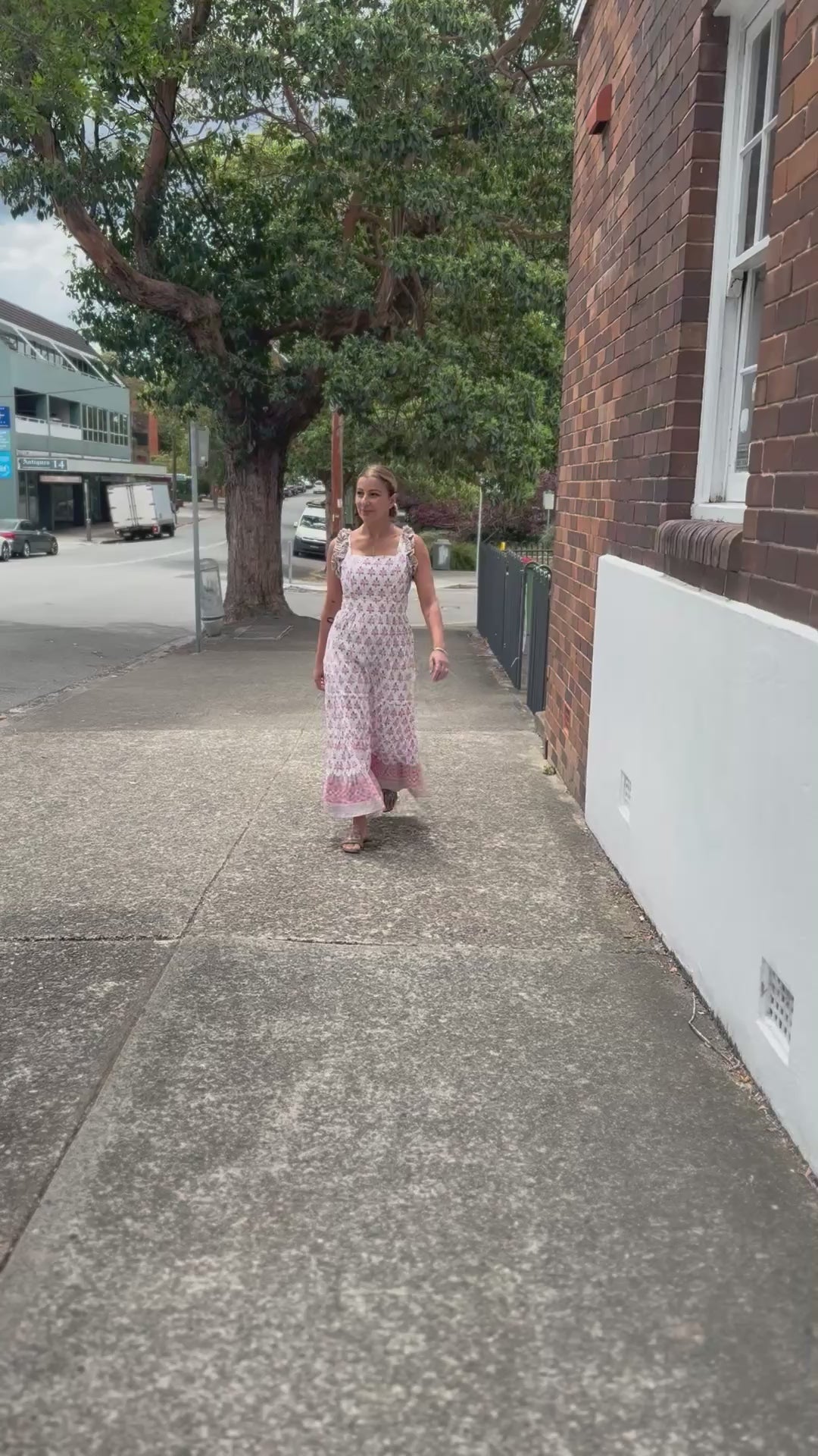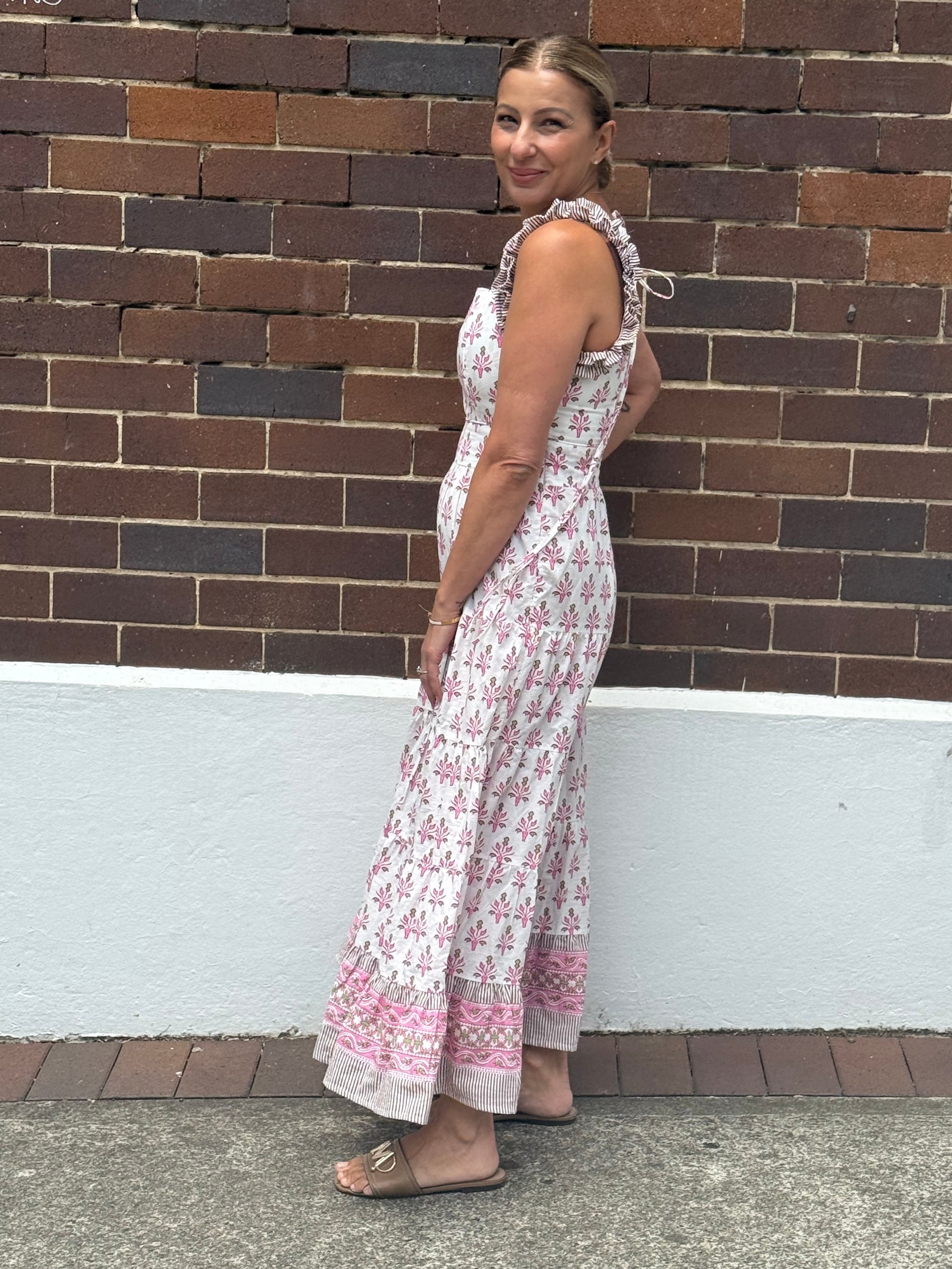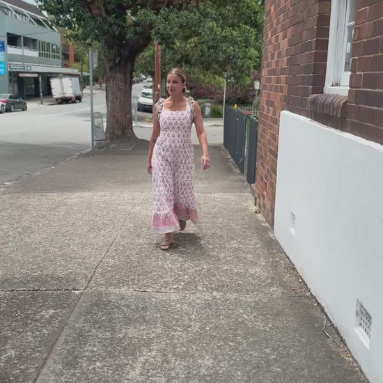 Crafted from 100% breathable cotton in our signature hand-block print, she’s detailed with ruffled straps, gentle ruching through the bodice, and those all-important side pockets (because we know you’ll use them). The tiered silhouette moves beautifully with every step - timeless, easy, and impossibly pretty.