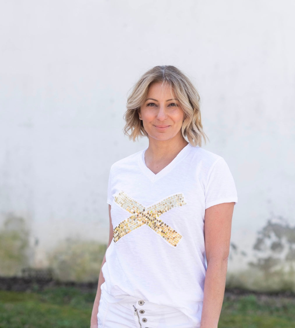 We’ve zhuzhed our best selling Wanderlust T. Wanderlust is made from a beautiful cotton that just gets better with time and we’ve added a hand stitched sequin cross. It’s a slightly relaxed t, has raw edges with a cross on the front. Sizes xs-xxxl.